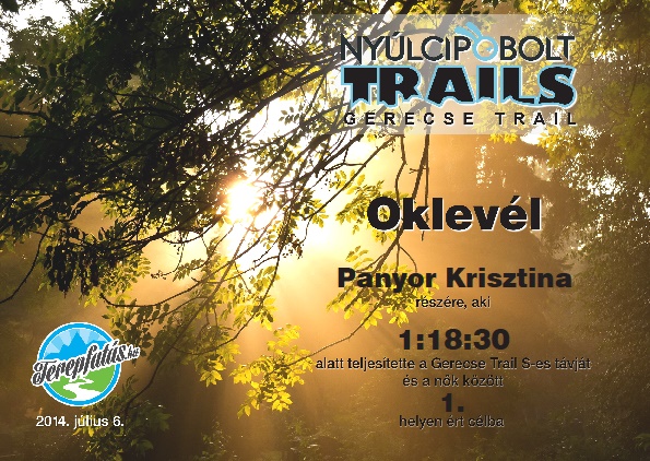 A kitartó munkának, és az eltökéltségnek köszönhetően a többhelyszínes versenysorozat gerecsei fordulóján a 261-es rajtszámú Panyor Krisztina az első helyen ért célba a 14,6 km-es terepen, amit 1:18:30 idő alatt teljesített.