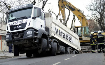 Beszakadt az úttest egy 30 tonnás teherautó alatt a XIII. kerületi Klapka utcában - tájékoztatta a Fővárosi Katasztrófavédelmi Igazgatóság szóvivője kedden délután az MTI-t.