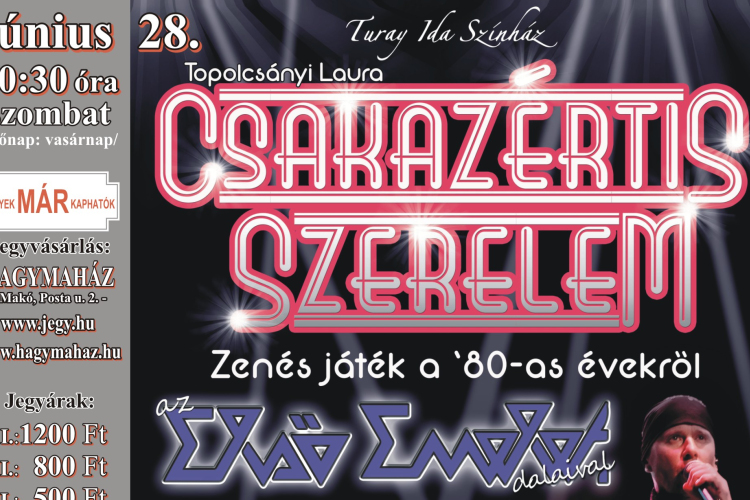 A Varidance táncjátéka után, most szombaton, a Csak azért is szerelem zenés darabot varázsolják a Hagymaház szabadtéri színpadára a neves színészek/énekesek: Patkó Béla, Keresztes Ildikó, és még sokan mások.