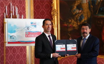 Forgalomba bocsátotta az idei Budapesti Víz Világtalálkozó alkalmából kibocsátott egyedi bélyeget Áder János köztársasági elnök és Schamschula György, a posta vezérigazgatója hétfőn a Sándor-palotában Budapesten.