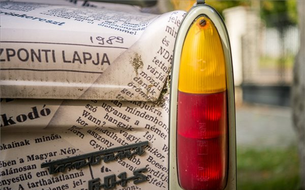 Egy korabeli újságkivágásokkal díszített Trabant 601-es Budapesten, a Máltai szeretetszolgálat központjánál 2017. november 2-án. Az autót kelet-németek hagyták hátra, amikor a határnyitásra vártak a szeretetszolgálat kertjében táborozva 1989-ben. Hatvan éve, 1957. november 7-én hagyta el a kelet-németországi zwickaui autógyárat az első Trabant gépkocsi. MTI Fotó: Balogh Zoltán