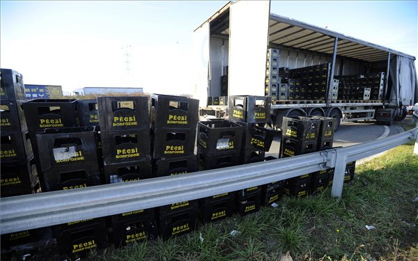 Sörösrekeszek és üvegek, egy teherautó leborult rakománya az úton az M0-s és az M51-es autóút csomópontjában lévő körforgalomban november 23-án.