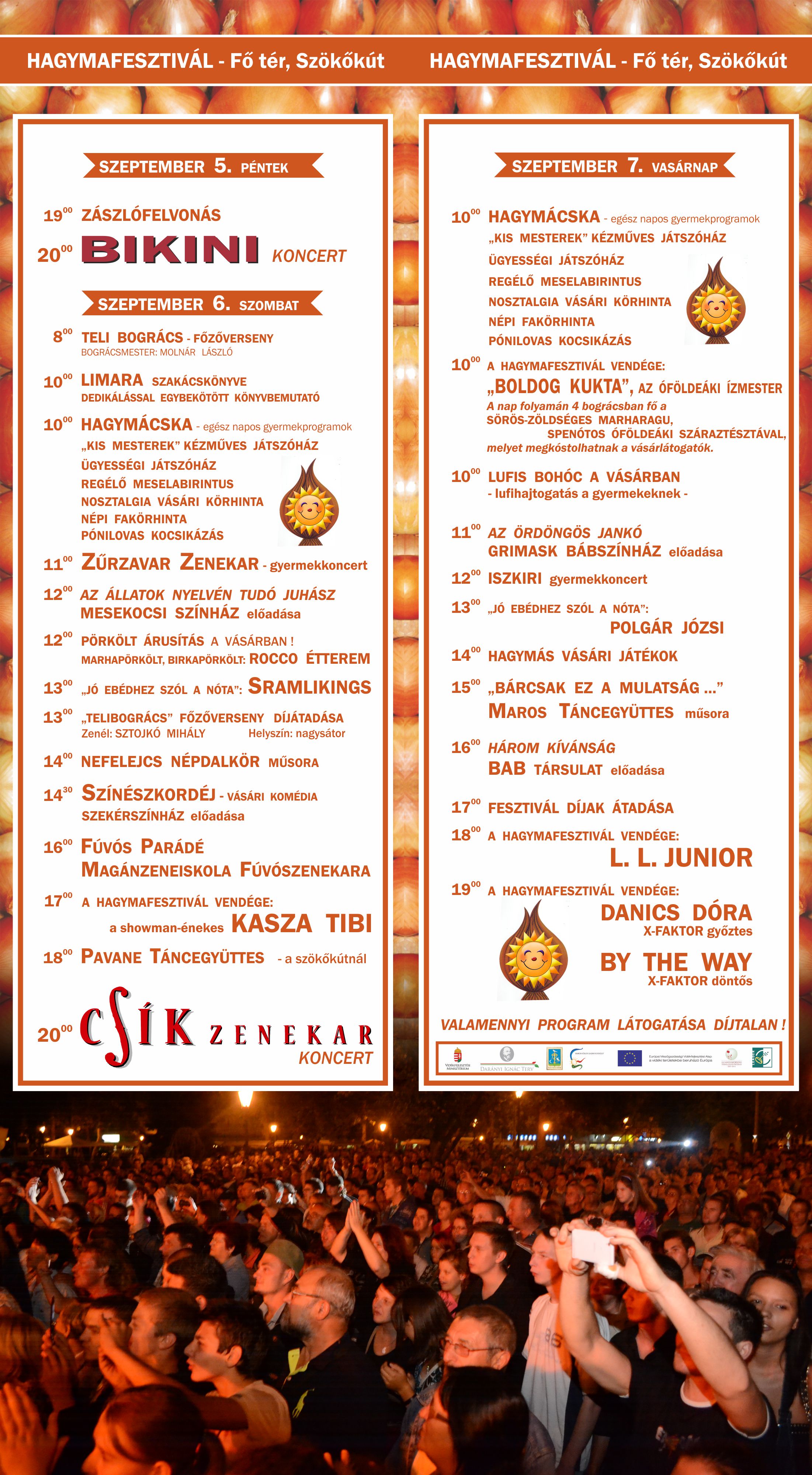 A Hagymafesztiválon ott lesz majd Limara, aki a nemrégiben megjelent könyvét fogja dedikálni, az esemény vendége lesz "Boldog Kukta", az óföldeáki ízmester, valamint fellép többek között Kasza Tibi, L.L. Junior, Danics Dóra és a By the Way is, de a legnagyobbat két koncert fog szólni: pénteken este nyolctól a Bikini, szombaton este nyolctól pedig a Csík Zenekar fog a Fő téren zenélni.
