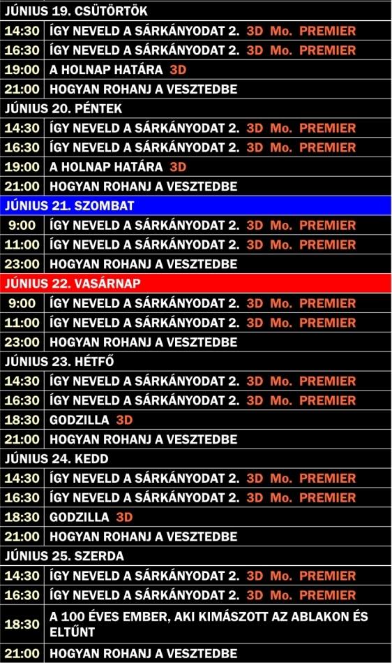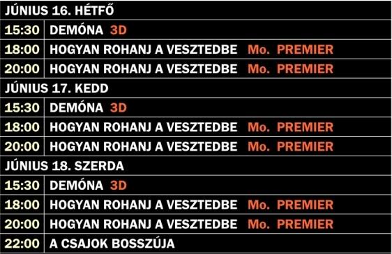 június 12. 18:00 és 20:00, június 13. 18:00 és 20:00, június 14. 18:00 és 20:00, június 15. 18:00 és 20:00, június 16. 18:00 és 20:00, június 17. 18:00 és 20:00, június 18. 18:00 és 20:00, június 19. 21:00, június 20. 21:00, június 21. 23:00, június 22. 23:00, június 23. 21:00, június 24. 21:00