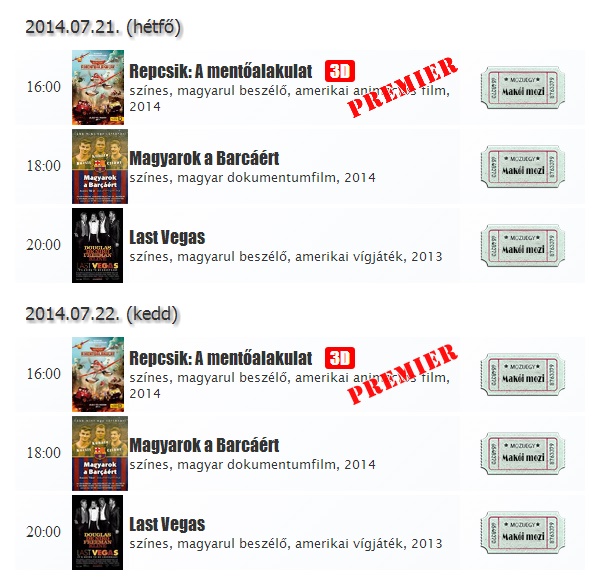Helyfoglaláshoz ki kell választani a megnézni kívánt filmet, rákattintani, és kiválasztani az ülőhelyet. www.makoimozi.hu