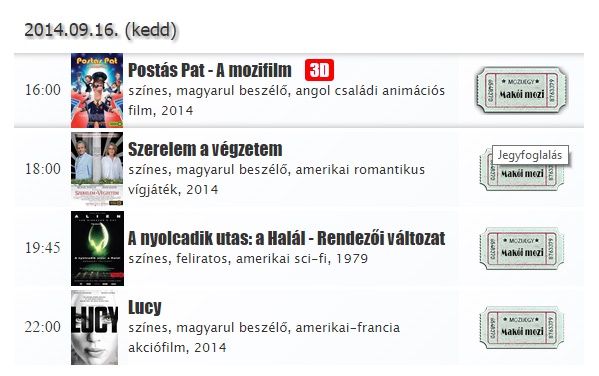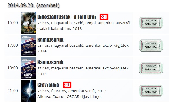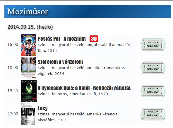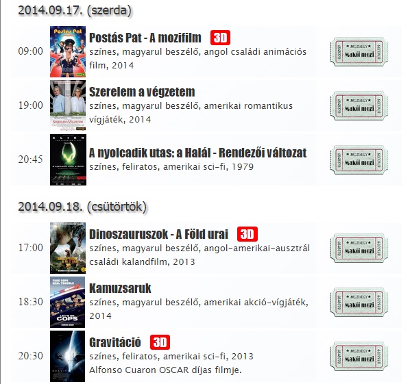 Helyfoglaláshoz ki kell választani a megnézni kívánt filmet, rákattintani, és kiválasztani az ülőhelyet. www.makoimozi.hu