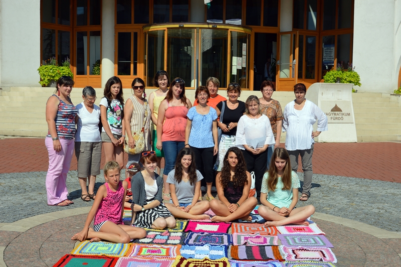 Rendhagyó módon a szabadban, a Hagymatikum előtt rendezték meg szombat délelőtti szakkörüket a horgolók: a téren kiterítették a készülő Óriástakaró négyzeteit.