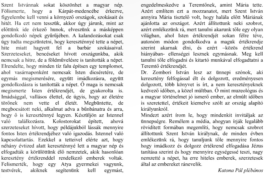 Az ünnepség első momentumaként felcsendült a Magyar Himnusz, majd Katona Pál plébános, és Dr. Zombori István történész dicsőítette országalapító királyunkat, Szent Istvánt.