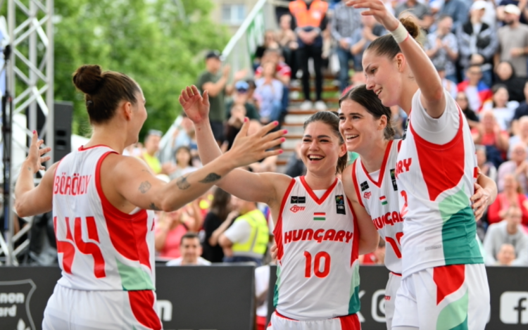 Debrecen, 2024. május 19. Böröndy Vivi, Papp Klaudia, Szabó Fanni és Kiss Virág (b-j) a 3x3-as kosárlabda olimpiai selejtezőtorna női negyeddöntőjében játszott Magyarország - Csehország mérkőzés végén Debrecenben 2024. május 19-én. A magyar válogatott 16-9-re győzött