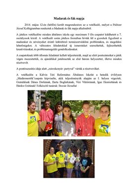 2014. május 12-én (hétfőn) került megrendezésre az a vetélkedő, melyet a Pulitzer József Kollégiumban rendeztek a Madarak és fák napja alkalmából.