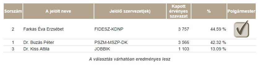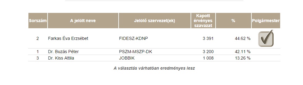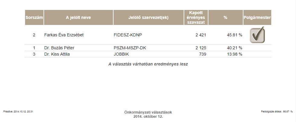 A makói polgármester választások részeredménye 66,67%-os feldolgozottságnál 20 óra 31 perckor.