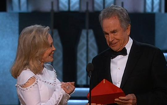 A legfontosabb kategória, a legjobb film győztesét Faye Dunaway és Warren Beatty, az ötven éve bemutatott Bonnie és Clyde című klasszikus két főszereplője jelentette be. A színész azonban rossz borítékot kapott, habozott is felolvasni a papíron álló szöveget, mert azon az előző, a legjobb női főszereplő kategória nyertesének, Emma Stone-nak a neve és a Kaliforniai álom címe szerepelt. Faye Dunaway azonban magához ragadta a szót, és kihirdette győztesnek a népszerű musicalt. Mint hamar kiderült, tévedésből.