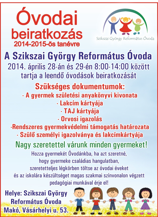A Szikszai György Református Óvoda 2014. április 28-án és 29-én 8:00-14:00 között tartja a leendő óvodások beiratkozását