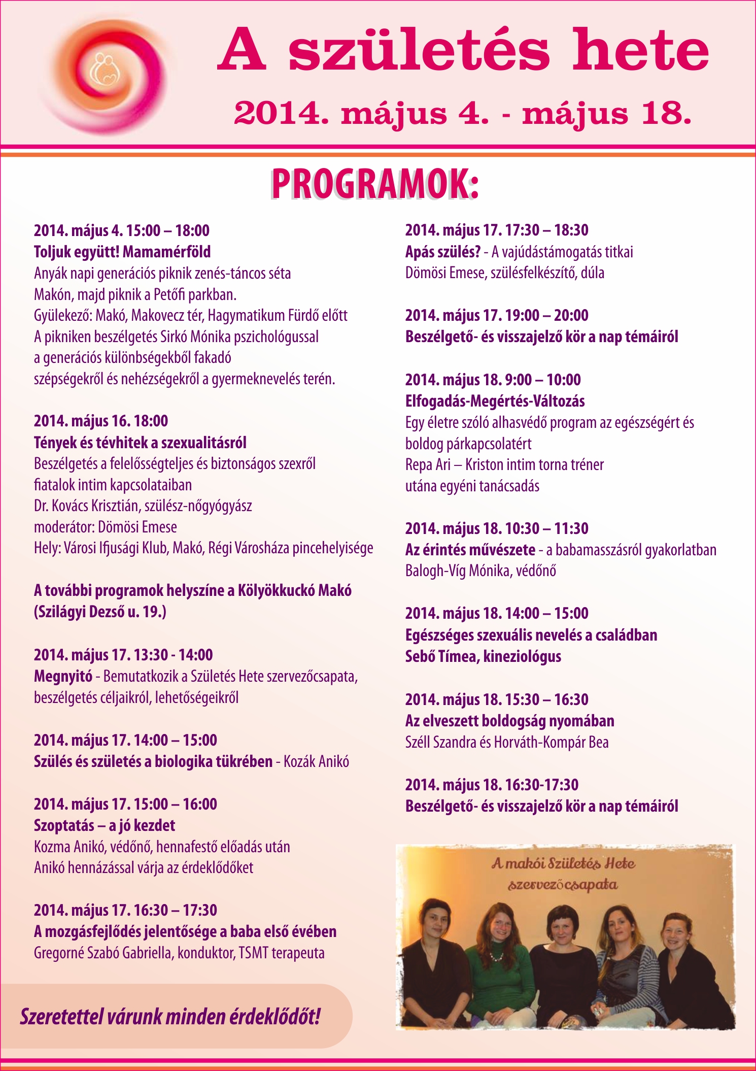 Az anyaközpont után érdeklődők a rendezvénysorozat helyszínein, vagy az anyakozpontmako@gmail.com e-mail címen kaphatnak további tájékoztatást.