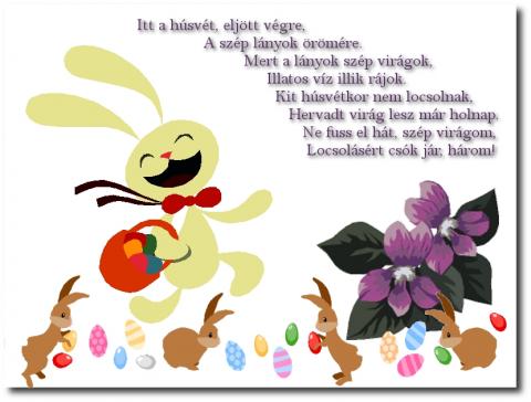Az erdőben nyuszi honol, A természet vizzel locsol. Kezdődik a locsolás,nekem is jut 1-1 tojás.