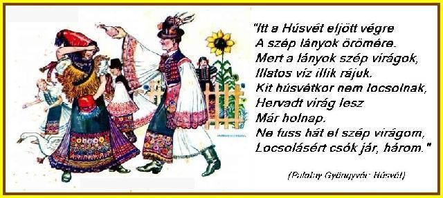 Kinyilott a gyöngyvirág Kinn a hegyoldalban, Hervadoz a nefelejcs Idebenn a házban. Meglocsolnám a tövét, Ne hervadjon tovább, Rózsaviz a kulacsomban, Érezze illatát ! Piros tojás az asztalon, Rám ne kelljen várni, Kérdezem a ház asszonyát, Szabad-e locsolni ?